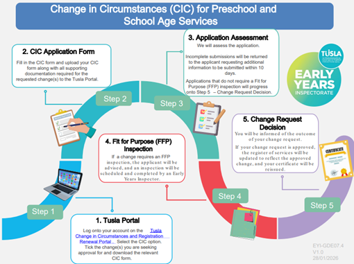 All Change in Circumstance (CIC) applications, for Early Years and School Age Services (not childminders) must be submitted through the Tusla Change in Circumstance and Registration Renewal Portal available here.