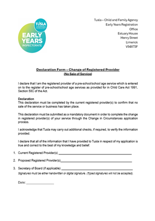 Declaration Form - Change of Registered Provider (No sale of Service) |